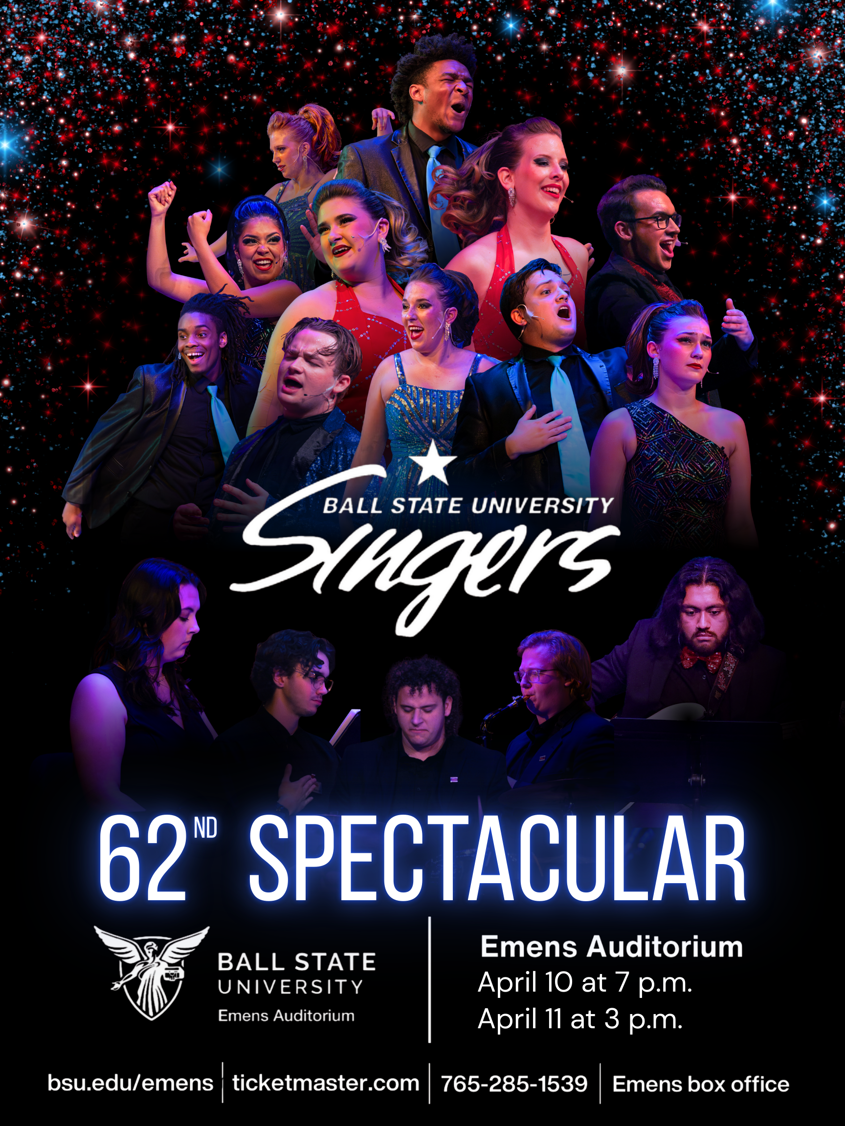 Join us in commemorating the 62nd Anniversary of the Ball State University Singers this April! Experience an evening filled with Faith, Hope, Laughter, and Love at Emens Auditorium on April 10th (7pm) and 11th (3pm). Secure your tickets online or grab them at the door on the day of the event. Ticket prices will increase on the day of the show. Don’t miss out on this spectacular celebration!